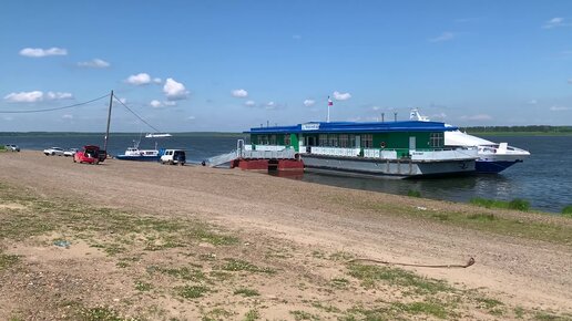 Красивый вид на реку Енисей и причал в городе Енисейск. Лето в Сибири