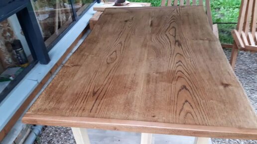 Стол из горбатых дубовых досок. Сделал крепление для подстолья, закрыл торцы и покрыл маслом.