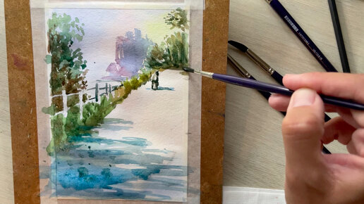 Дорога к замку на скале. Акварель для начинающих