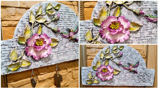 Взяла в магазине ненужную картонную коробку, добавила массу для лепки и сделала полезную вещь для дома. Панно-ключница с цветами.