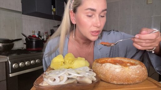 МУКБАНГ/СЕЛЕДКА С КАрТОШКОЙ И БОРЩ В ХЛЕБЕ