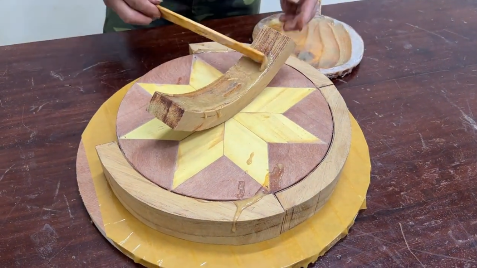 Беру бревно и брусок большого размера, обрабатываю на станке. Получаем тарелку.