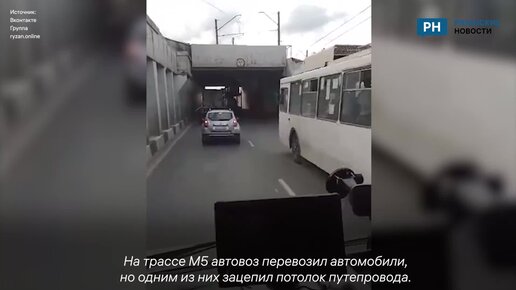 В Рязани автовоз зацепил перевозимым автомобилем потолок путепровода