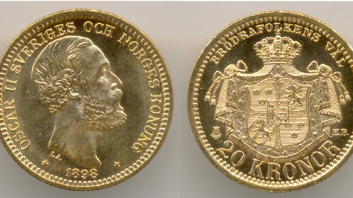 Нумизматика. Золотая монета. Швеция, 20 крон 1898 года.
