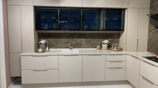 Эффектное сочетание фасадов цвета айвори и медных элементов .