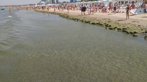 Сегодня на пляжах Анапы водорослей немного меньше, чем вчера, море по-немногу очищается. Но еще сильно грязное, зеленое. 27 июля 2023.