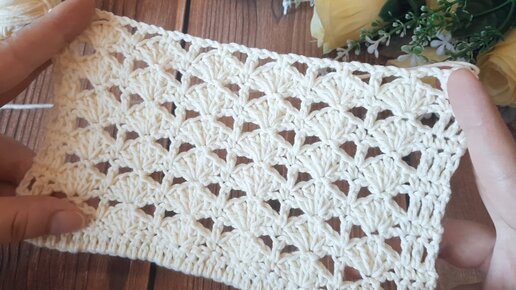 Простейший узор с веерками крючком. Всего 2 ряда.