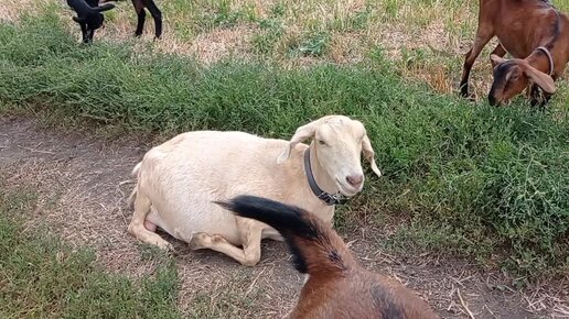 Прогула с козами. Шати и Белла едят траву лёжа.