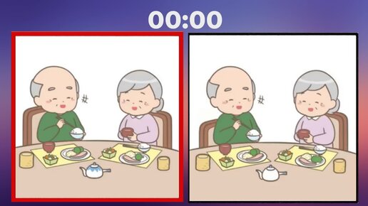 Дедушка и бабушка завтракают. Найди три отличия на картинке.