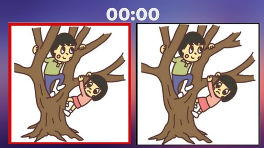 Мальчик и девочка залезли на дерево. Найди три отличия на картинке.