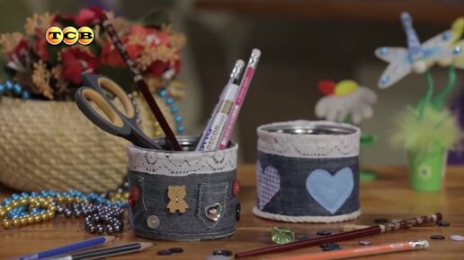 Стаканчик из банки для орешков и старых джинсов. Мастер-класс
