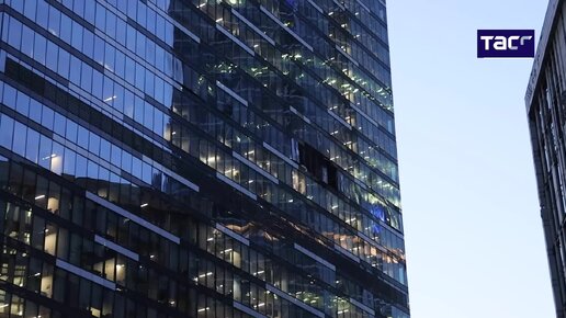 Последствия попадания беспилотника в одну из башен Москвы-Сити