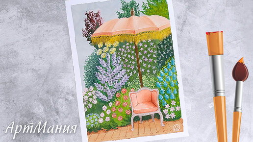 Кресло в саду - демо видео с процессом рисования гуашью и цветными карандашами.