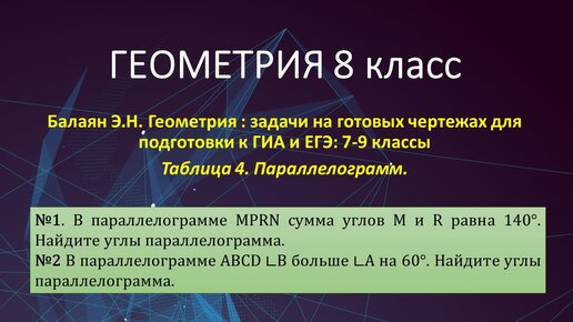 Геометрия 8 класс. Параллелограмм. Задачи на готовых чертежах. Найдите углы параллелограмма_№№ 1 и 2.