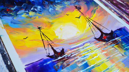 Небо, море, облака, корабли и вода. Рисую картину шпателем.
