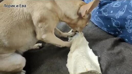 той-терьер Ева забрала "ногу" у добермана Лорда.😁 Смелая девочка.