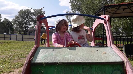 Сестрёнки в автомобиле. Детская площадка в Вологодской деревне. Куда поехать с детьми на лето.