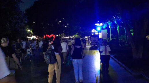Сколько гуляет отдыхающих в вечерней Ялте на набережной. Отдыхающие танцуют и веселятся у моря