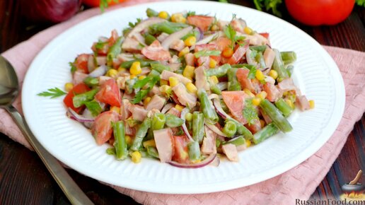 Порадует сочностью и яркостью красок. Салат со стручковой фасолью, ветчиной, помидорами и кукурузой.