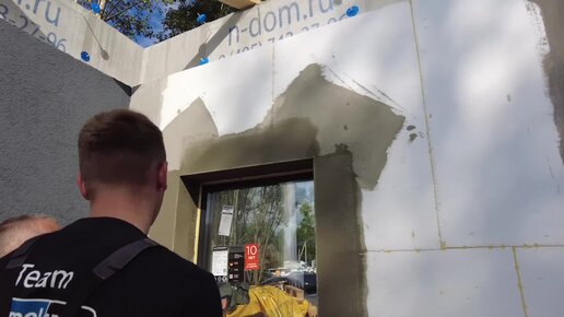 Технология оштукатуривания пенопласта на фасадах дома, базовый армирующий слой из клея Baumit и Фасадной Стеклотканевой Сетки Bautex 2000