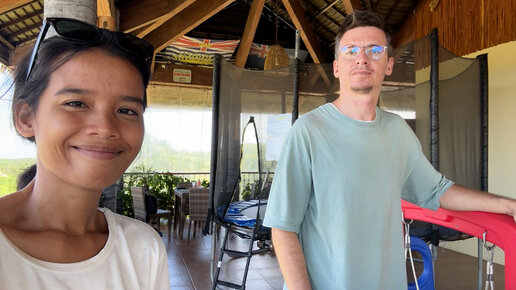 Проверяем строительство дома, показываю что уже сделали, Найви достала кокос, а Юрчик кайфует в гамаке