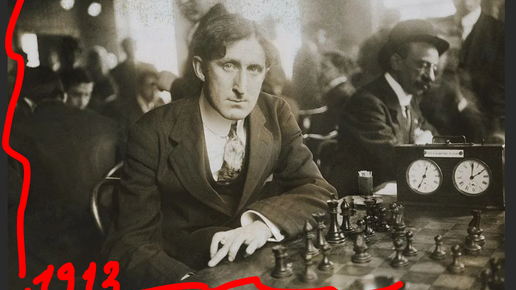 Фрэнк Маршалл хитро и смело идет на манхеттенский вариант в ферзевом гамбите, играя черными против О. Дураса в Нью-Йорке, 1913. Победа, 0-1