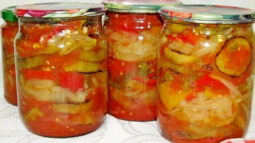 Готовлю раз 20 за лето, и на зиму обязательно заготавливаю. Заготовка без уксуса. У нас это салат номер 1, с баклажанами.