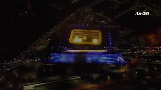 Стадион Калининград ночью. Подсветка. Ночной Калининград, съемка с высоты.
