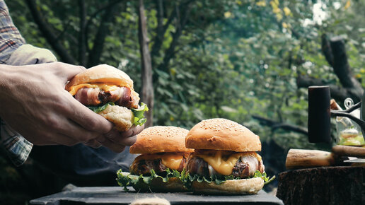СУПЕР СОЧНЫЕ БЕКОНОВЫЕ БУРГЕРЫ С НАЧИКОЙ В КОТЛЕТЕ НА КОСТРЕ НА ПРИРОДЕ