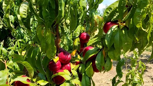 Показываю, как много нектарин в саду у нас, ветки ломятся от урожая.