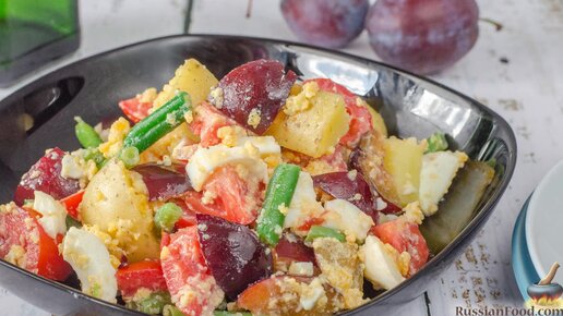 Все ингредиенты в необычном салате гармонично объединены. Картофельный салат со сливами и стручковой фасолью.