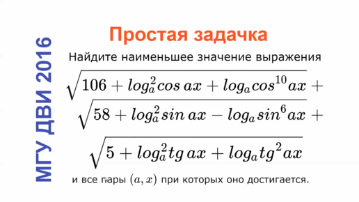 Простая задачка 1, МГУ ДВИ 2016, Наименьшее значение, Математика, ДВИ, Олимпиады, ЕГЭ