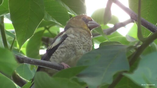 Слёток дубоноса спрятался в ветвях ореха, взрослый дубонос поймал саранчу для своего птенца и теперь смотрит где спрятался его малыш.