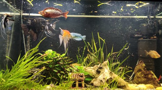Аквариум 170 литров.Вода в аквариуме нагрелась до 29 градусов.Мои "Рыбули" очень хорошо себя чувствуют.
