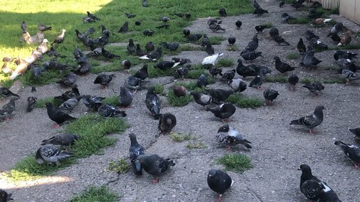 Добрый человек кормит голубей на остановке