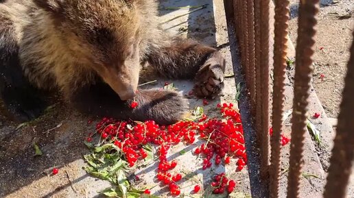Медвежонка Тюбика угостили красной смородиной