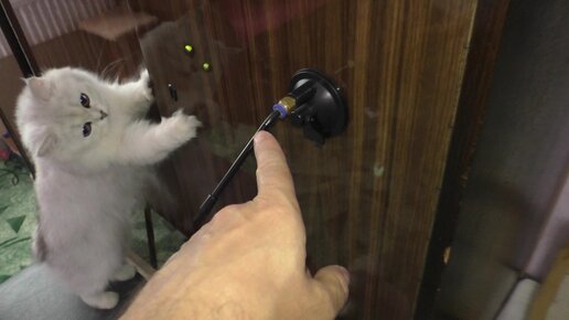 Котенок играет с игрушкой, а кошка мама смотрит на палочку