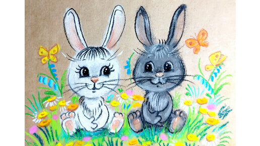 🐇🐰Зайка белый, зайка серый. Рисунок сухой пастелью и карандашами на крафтовой бумаге.