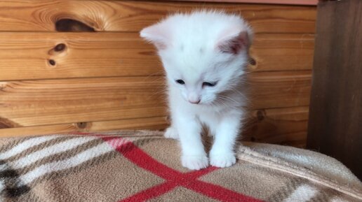 Белый котенок. Смелый. Первый раз без мам. Маленький котик.