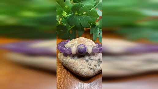 Браслет-оберег "Хранитель равновесия"на основе аметиста и чароита с руной Алгиз со вставками из розового кварца.