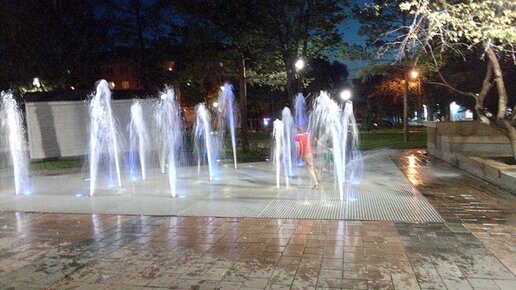 Фонтан в ночном сквере или летняя детская радость в большом городе