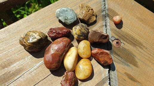 Минералы в декоративной гальке на даче. Яшма, кварц, сердолик, окаменелое дерево