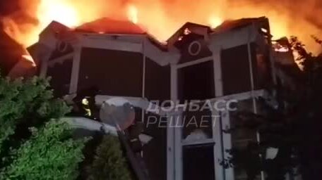 Жилой дом полыхает после обстрела кассетными снарядами ВСУ Киевского района Донецка