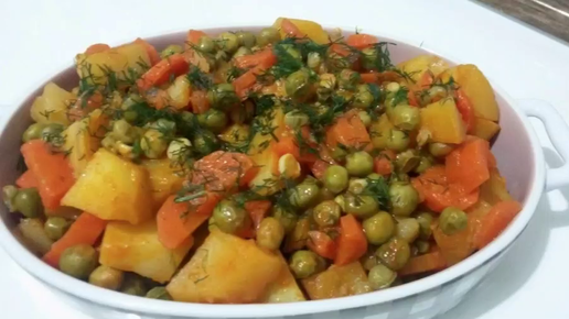 Картошечка тушеная по-деревенски с свининой, овощами, грибами и зеленым горошком! Вкусно так, что пальчики оближешь!