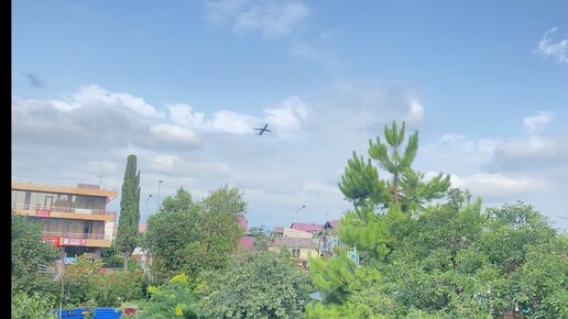 Самолет взлетает из аэропорта в Адлере . Очень сильный шум, гул.