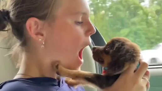 Кусь-кусь Щеночек мило играет со своей хозяйкой