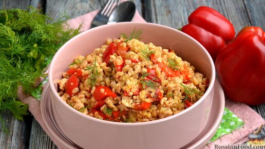 Блюдо получается сочным и ярким. Булгур с фаршем, сладким перцем и сметаной.