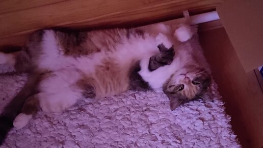 Тихий час бездомной кошки. Кошка валяется на топчане, радуется жизни и зевает. Машка ночь гуляла и после еды решила выспаться на своем месте