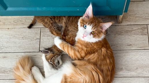 Любовь и ненависть мейн-куна Лорда и рысят / Реакция котёнка рыси на живую свинью
