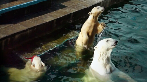 Герда плавает с синей канистрой, а медвежата купаются в бассейне с красной лейкой.